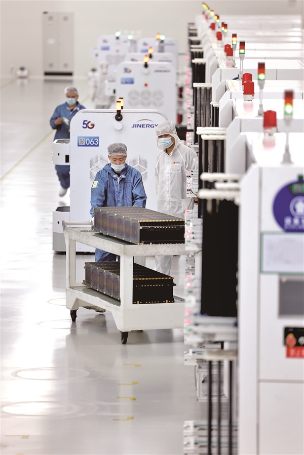 9月15日,在晉能光伏技術(shù)有限責(zé)任公司TOPCon智能制造車間,全自動智能流水線高速運轉(zhuǎn),沿著地面隱形軌道、靈活穿梭的AGV機器人忙碌地供料、轉(zhuǎn)運,機械臂靈活地將物料從小車上抬起并放入相應(yīng)的生產(chǎn)線,整個過程一氣呵成。電池片經(jīng)過一系列自動化加工工序變成一塊塊的光伏組件,每個工段僅配一名工人處理異常以及輔助產(chǎn)線抽檢工作,其余的步驟幾乎都是由機器人操作。