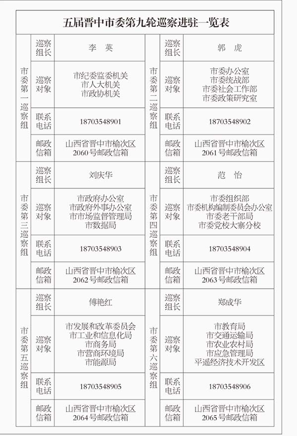 市委巡察組將在被巡察單位工作三個(gè)月左右,期間設(shè)立專門聯(lián)系電話和郵政信箱,受理反映被巡察黨組織領(lǐng)導(dǎo)班子及其成員、下一級(jí)黨組織領(lǐng)導(dǎo)班子主要負(fù)責(zé)人和重要崗位人員的來信來電來訪,重點(diǎn)是關(guān)于違反政治紀(jì)律、組織紀(jì)律、廉潔紀(jì)律、群眾紀(jì)律、工作紀(jì)律、生活紀(jì)律等方面的舉報(bào)和反映。巡察受理信訪時(shí)間為工作日正常上班時(shí)間,受理信訪日期截止到2025年12月25日。