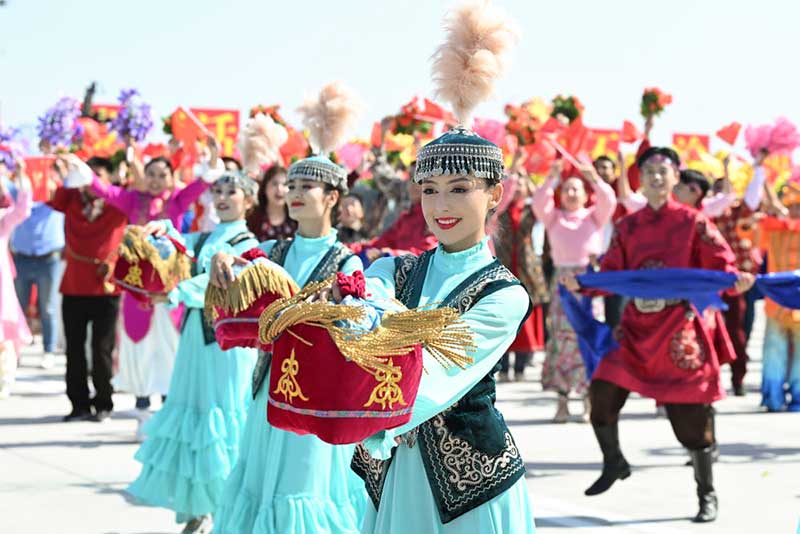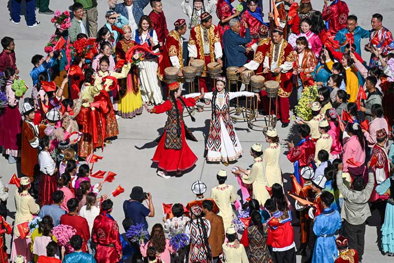 新華社記者的鏡頭里,各族兒女簇?fù)碓谝黄?,歡笑在一起;明艷的服飾、熱烈的歌舞,無不展現(xiàn)出團結(jié)與奮進的力量。