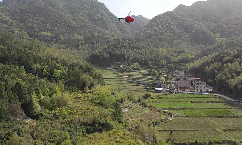 圖為作業(yè)中的交叉雙旋翼無(wú)人直升機(jī)。
