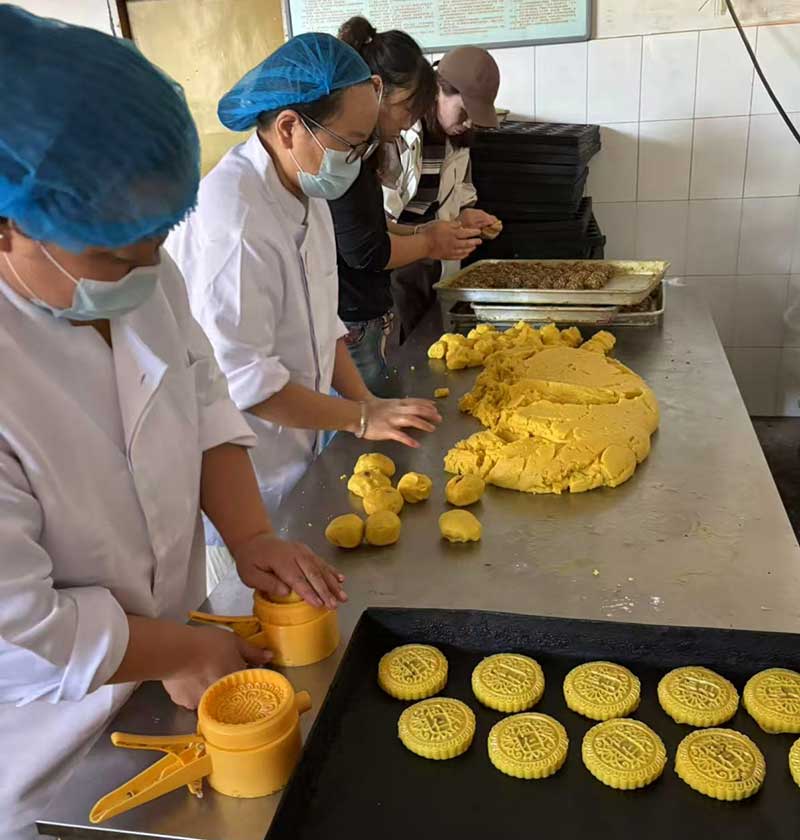 走進(jìn)作坊,清香四溢。精面粉、精制白糖、芝麻、核桃仁、杏仁、冰糖、葡萄干等十余種配料整齊擺放,卻沒有太多花哨的招式。這里堅(jiān)持的是最傳統(tǒng)的手工月餅技藝,從準(zhǔn)備餡料到制作餅皮,從包餡兒到制形,最后烘烤出爐,每一道工序都需要匠人們的專心致志和一絲不茍。
