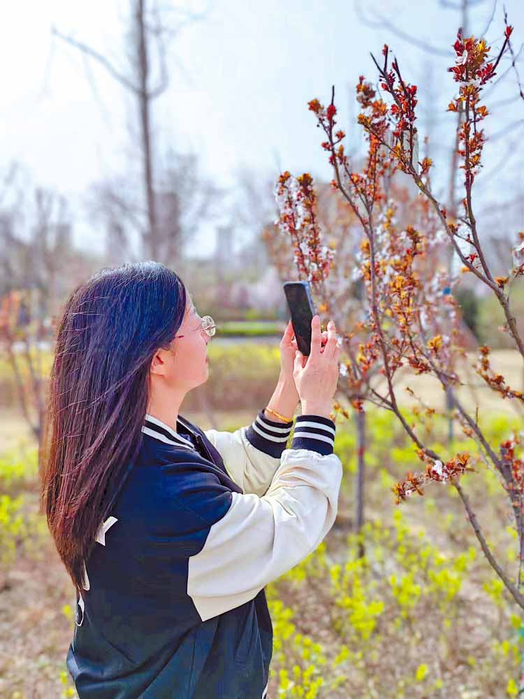 游人在介休市北壇公園拍攝盛開(kāi)的春花