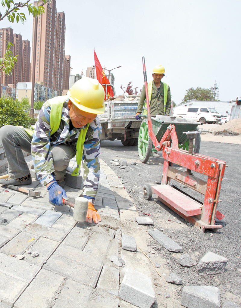 市市政公用事業(yè)服務(wù)中心黨員突擊隊施工人員降低路面?zhèn)仁佋O(shè)人行道