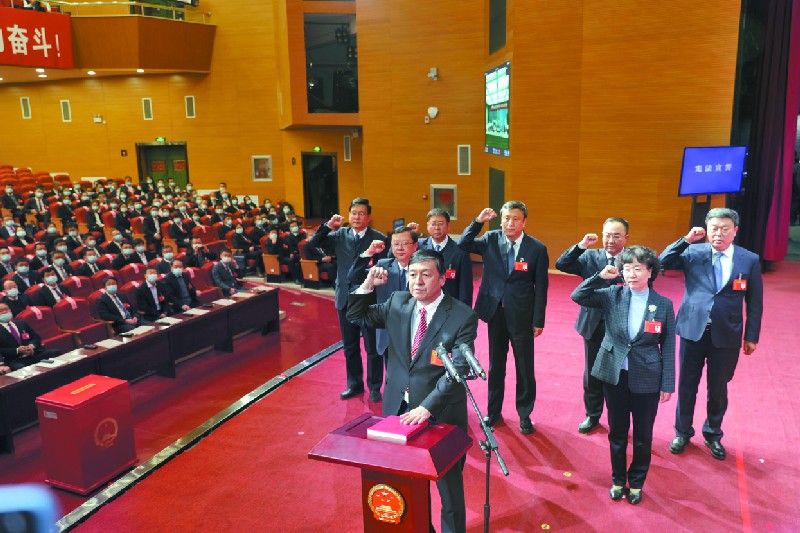 新當(dāng)選的市人大常委會主任、副主任、秘書長進(jìn)行憲法宣誓